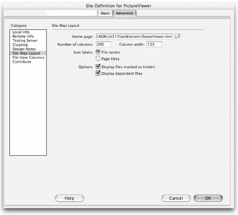 To be able to see a Site Map diagram view (as shown in Figure 38-27), you must have a page defined as your Home page in your site definition and also be able to view any dependent files. You can specify this in the Site Map Layout section of the Site Definition dialog box as shown in Figure 38-28. To load the Site Definition dialog box, choose Site ð Manage Sites from the application menu (or from the Files panel options menu), and then click the Edit button in the Edit sites dialog box.