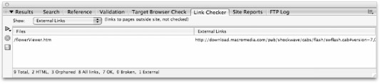 The results of this check appear in the Link Checker tab of the Results panel (refer to Figure 38-29). You can then view them by category — broken links, external links, and orphaned files — and also change the links from this window simply by typing over the link URLs.