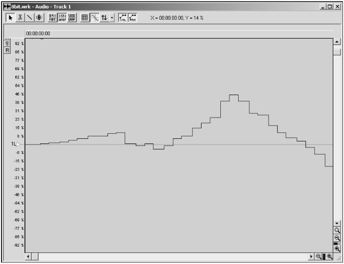 Refer to Figures C-1 and C-2 for a comparison of the differences between sounds at different sample rates and bit depths. Both figures show a wave form derived from the same original sound file, differing only in their sample rates and bit depths. The waveform of the 16-bit 44.1 kHz sound has twice as many points — or samples of information — as the 8-bit 11.025 kHz sound. Because the 16-bit 44.1 kHz sound has more samples, the gap between each sample isn't as large as the gaps of the 8-bit 11.025 kHz sound. More samples result in a much smoother, cleaner sound.