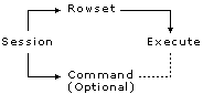The session object creates a rowset object. If the provider supports commands, the session also creates a command object (CCommand, implementing the OLE DB TCommand). The command object implements the ICommand interface and uses the ICommand::Execute method to execute commands on the rowset, as shown in the following figure.