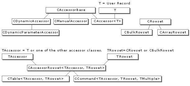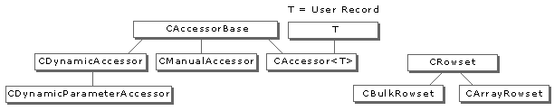 To set and retrieve data, OLE DB Templates use an accessor and a rowset through the CAccessorRowset class, as shown in the following figure. This class can handle multiple accessors of different types.