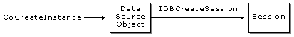 The OLE DB provider architecture includes a data source object and one or more sessions. The data source object is the initial object every provider must instantiate. When a consumer application needs data, it cocreates the data source object to start the provider. The data source object creates a session object (using the IDBCreateSession interface) through which the consumer connects to the data source object. ODBC programmers can think of the data source object as being equivalent to the HENV and the session object as equivalent to the HDBC.