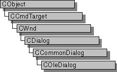 The COleDialog class provides functionality common to dialog boxes for OLE. The Microsoft Foundation Class Library provides several classes derived from COleDialog.