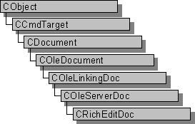 The CRichEditDoc class, with CRichEditView and CRichEditCntrItem, provides the functionality of the rich edit control within the context of MFC’s document view architecture. CRichEditView maintains the text and formatting characteristic of text. CRichEditDoc maintains the list of client items which are in the view. CRichEditCntrItem provides container-side access to the OLE client items.