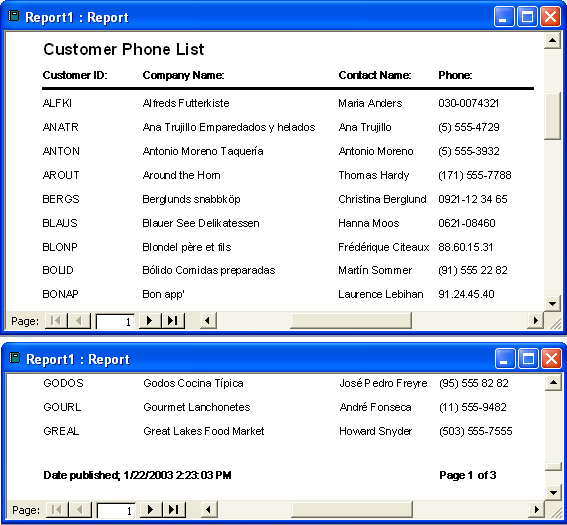 Figure 6-9 displays two excerpts from this report. The top panel shows the report's title above the column headers on the first page. It also shows the first several rows of customer phone numbers. The bottom panel shows the Page Footer contents along with the last several rows of data on the first page. If you change the height of the Detail section from that displayed in the example, different rows will appear at the bottom of the page.