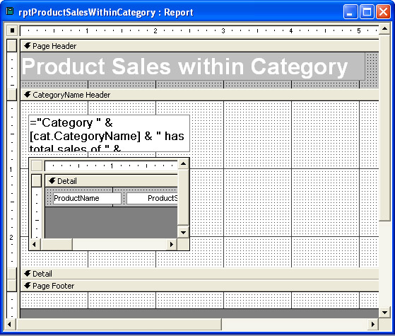 Figure 6-20 shows the Design view for the main report (rptProductSalesWithinCategory) of the report we just discussed. Recall that the record source for the main report and subreport is qryProductSalesWithinCategory. The main report includes a CategoryName Header section. In fact, both of the main report's data-bound controls—the text box and the subreport—reside in the CategoryName Header section.