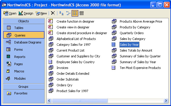 Figure 11-2 shows the Database window for the NorthwindCS Access project. This project is a sample file that you can load with the Office 2003 setup installation program. You should have MSDE 2000 or SQL Server 2000 on your workstation before loading the NorthwindCS sample. This is because the sample Access project installs the NorthwindCS database the first time that you open it if no other version of the Northwind database exists on the local SQL Server machine. In any event, you must have a version of either the NorthwindCS or Northwind database installed on the local SQL Server machine for the NorthwindCS Access project file to open successfully the first time. After the Access project file connects to a database on a server, you can open it from another computer or you can make a copy of the Access project file and then open that copy from another computer.