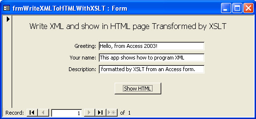 The novel aspect of the extension is the use of an Access form to gather input that, in turn, populates element values. The code behind the form writes out an XML file as a textstream object to a file that holds the XML document (CustomHelloWorld.xml). Before persisting the textstream object to a file, the code inserts the contents of three text boxes on the form (frmWriteXMLToHTMLWithXSLT). A click event procedure for a button on the form opens the CustomHelloWorld.xml file, which displays as an HTML page in the pma11 Web site initially developed in Chapter 14. Figure 15-5 shows the form with some sample content in its text boxes, and Figure 15-6 reveals the page that displays when the user clicks the Show HTML button on the form.