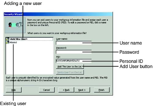The sixth window of the Security Wizard allows you to define the users who will use your database. In this step of the wizard, you supply each user's name, a password, and a unique personal identifier (PID), and then you click the Add This User to the List button (see Figure 22.21). To delete a user, you select that user and then click the Delete User from the List button. You click Next when you are finished defining all users. Figure 22.21. The sixth step of the Security Wizard, where you define the users of your database.