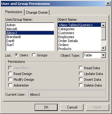 Step 11: Assigning Rights to Users and GroupsSo far, you have created groups and users, but you haven't given any of your groups or users rights to objects in the database. The key is to assign specific rights to each group and then to make sure that all users are members of the appropriate groups. After that, you can assign each group specific permissions to the objects in the database. Access maintains user and group information in the system database; it stores permissions for objects in system tables in the application database file (that is, the .MDB file). After you establish a workgroup of users and groups, you must assign rights to specific objects in the database by following these steps: