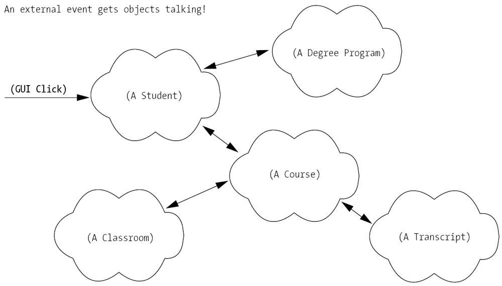 As soon as such a triggering event has been noted by an OO system, the appropriate objects react, performing services themselves or requesting services of other objects in chain-reaction fashion, until some overall system goal has been accomplished. For example, the request to register for a course as made by a student user via the SRS application's GUI may involve the collaboration of many different objects (see also Figure 4-1):