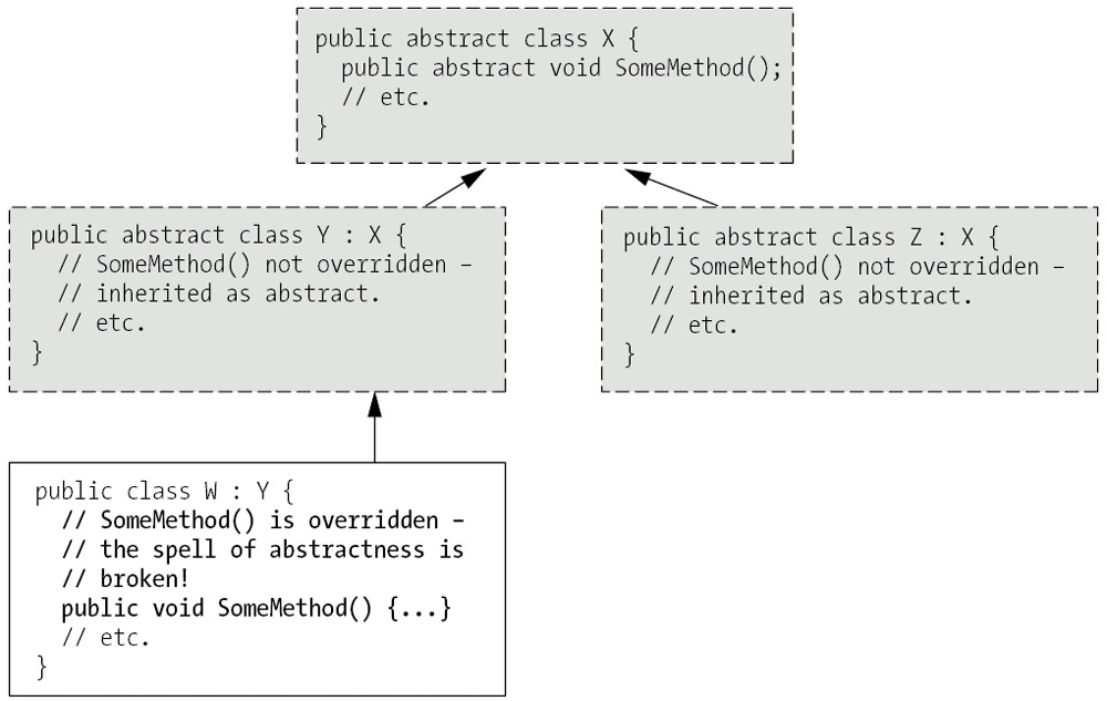 Unless a derived class provides a concrete implementation for all of the abstract methods that it inherits from an abstract base class, the derived class will automatically be rendered abstract, as well. In such a situation, the derived class of course can't be instantiated, either. Therefore, somewhere in the derivation hierarchy, a class derived from an abstract class must have concrete implementations for all of its ancestors' abstract methods if it wishes to "break the spell of abstractness"— i.e., if we wish to instantiate objects of that derived type (see Figure 7-3).