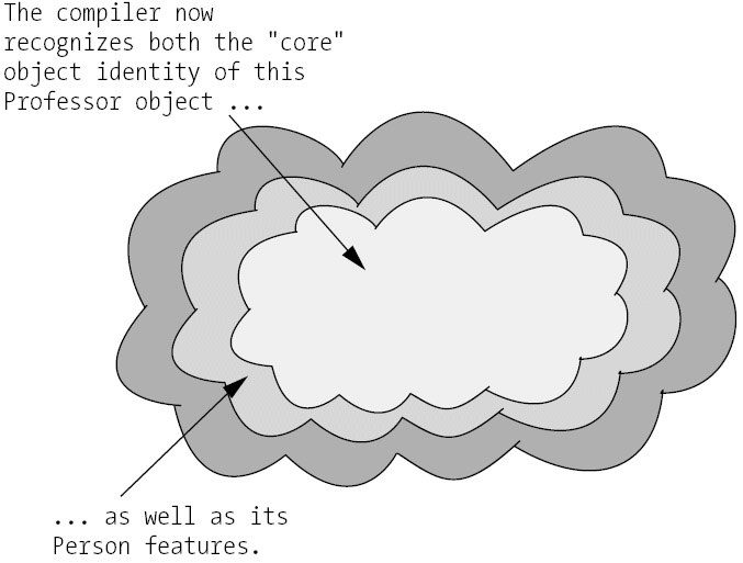 If we instead refer to the Professor object by its Person reference p, then, as far as the compiler is concerned, the only aspects of the object that exist are its Object "core" and its Person "extensions"; the "Professor-ness" of the object is in question (see Figure 13-16):