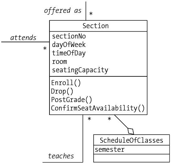 The teaches association between Professor and Section; the offered as association between Course and Section. |