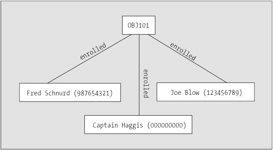 The view is the way in which we present this knowledge to the user—typically, although not exclusively, via a graphical user interface. Note that there can be many different views of the same model, in either the same or different applications. For example, with respect to the SRS GUI, we could represent the Students enrolled in a particular Section as a list of their names and student ID numbers; or as photographs; or in diagram form, as shown in Figures 16-2 through 16-4.