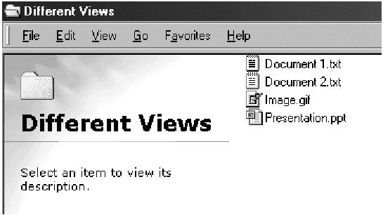 Give a single user the ability to switch among multiple views: A familiar example of this can be found within the Microsoft Windows operating system. With Windows, users are able to view the contents of a folder as icons, or as a detailed list, or as an HTML page, or even as a DOS directory listing, as shown in Figures 16-5 through 16-8.