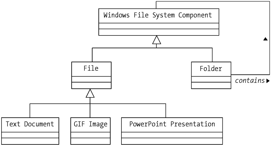 Regardless of the view chosen, however, the underlying model in our Windows example is the same: we have a directory titled "Different Views" on our file system, and it contains four files: two text documents, a GIF image, and a PowerPoint presentation, as reflected in the UML diagram in Figure 16-9.