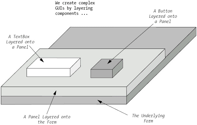 When building a C# GUI application, one main Form is created at a minimum to hold the objects necessary to provide the desired GUI appearance and functionality. Nontrivial GUI applications typically consist of multiple separate windows—one main Form and multiple other Form/MessageBox/Dialog objects that can represent such things as transient pop-up windows. (We'll use MessageBox objects when we build the SRS GUI, and will discuss them later in this chapter after we've explored event handling a bit.)