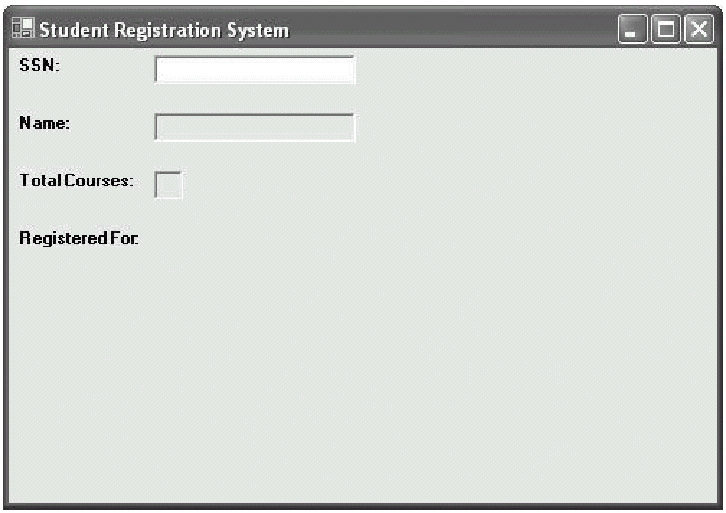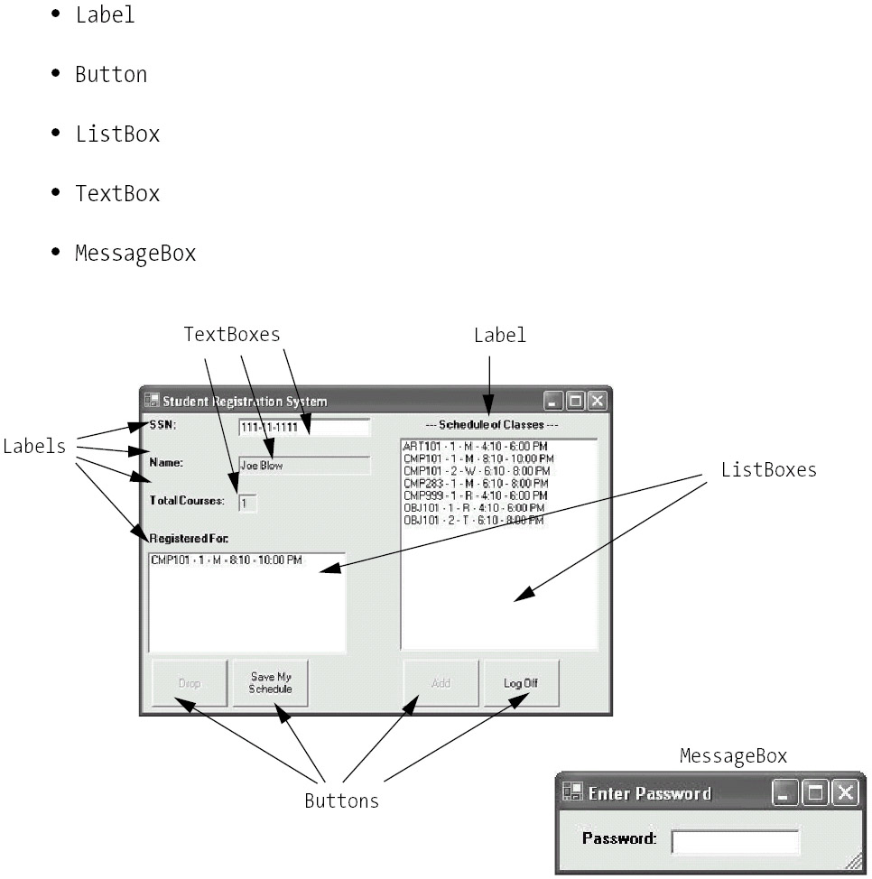 To log in to the SRS, the student will need to type his or her SSN into a field. The C# TextBox class will suit this requirement nicely. We can also use noneditable TextBox objects to display the student's name and the number of courses for which he or she is registered.