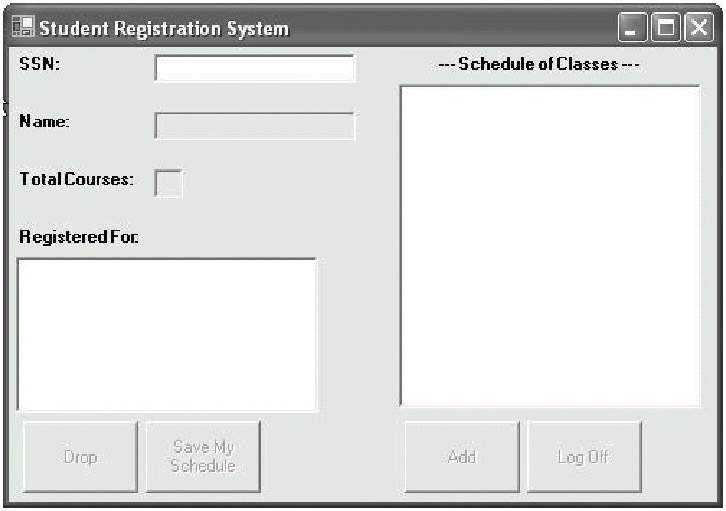 We're now finished with constructing the "view" of our SRS GUI. All of the GUI objects we'll need in order to accomplish the functionality as described in the SRS concept of operations have been created and placed onto the underlying Form. There is still some work to be done, however, because while our SRS GUI looks as it should, it doesn't actually do anything useful yet. Users can click the buttons or type something into the SSN text box, but nothing useful will happen, at least as far as student registration is concerned.
