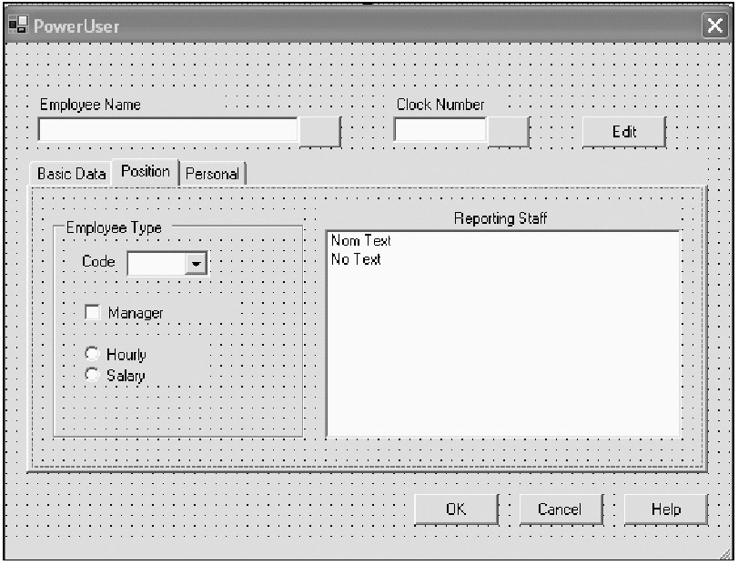 This example is a rewrite of the employee record form. Start a new project in C# or VB. Mine is called "PowerUser." There are two forms in this project. Here is what you need to do to set up the first form: