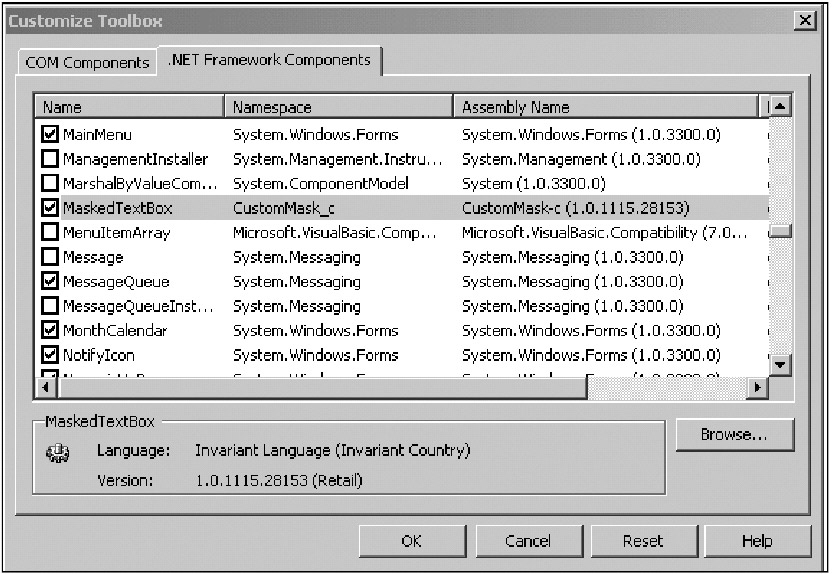 If you are writing in VB, click Browse and look for your DLL in the BIN subdirectory of your project. Select it and click OK on the dialog box. If you are writing in C# you will find the DLL in the BIN\Debug subdirectory of your project. Figure 8-7 shows the dialog box after you have chosen the control.