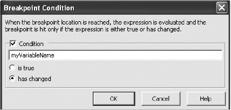 There's one final type of conditional breakpoint: fire whenever a variable changes. This is an extremely useful tool—hundreds of bugs could easily be solved if only we knew when a particular variable was being unexpectedly modified. Unfortunately, C# took a minor step backwards with this breakpoint type. In C++, you can use the Data tab of the breakpoints window, and the breakpoint will fire whenever the variable changes—you don't have to specify a line for the breakpoint to go on because the breakpoint will just stop on whatever line is appropriate. Unfortunately, the Data tab doesn't work in C#. However, you can simulate it. Set a conditional breakpoint, and for the condition, select the "has changed" option as shown in Figure 8-3.