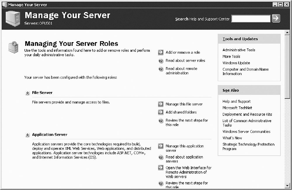 The administrative tools have also been improved, with more wizards and options for configuring the system. Figure 2-1 shows the Manage Your Server Wizard starting page, which helps administrators configure the server for different uses.