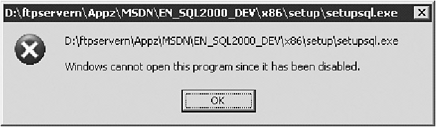 The Web Edition is not intended for any other use but as a Web server. This means you cannot install other .NET enterprise servers on this platform. SQL Server, Exchange Server, and most other enterprise servers just will not be allowed to install, as Figure 2-3 shows.