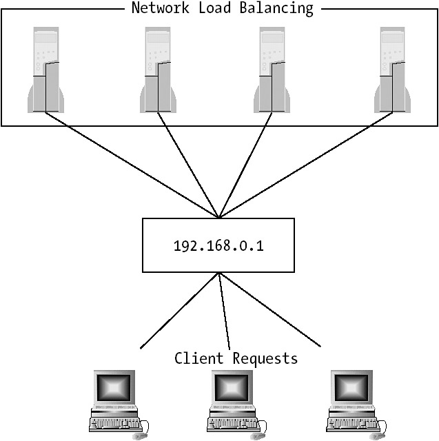 As mentioned already, one way to increase both scalability and availability is by using Network Load Balancing, which allows you to cluster up to 32 servers to respond to IP requests. This comes in handy when you need to distribute Web client requests among a cluster of Internet Information Services (IIS) servers, for instance. The benefit of this is that the client trying to use the service only has to remember one IP address, and NLB hides all servers in the background. If the server handling the client's request fails, another server takes its place, and the client should not notice the switch, as illustrated in Figure 3-2.
