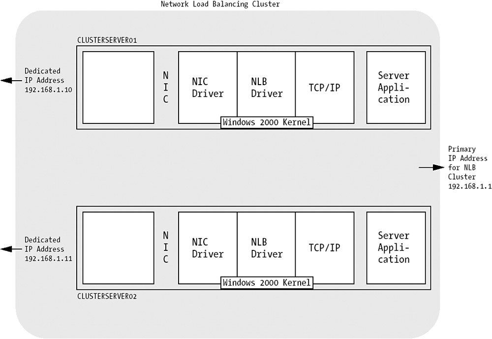 The NLB driver executes in parallel on each member of the cluster. This is called distributed software architecture and is great because it makes it possible not to have a single point of failure. Network Load Balancing will still function if one or more servers fail.