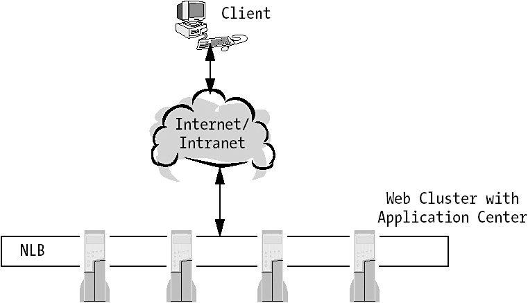A typical scenario using Network Load Balancing might look like Figure 3-11. Application Center in this scenario eases the task of administering the cluster. Adding and removing (setting members online or offline) is handled through the Application Center user interface.