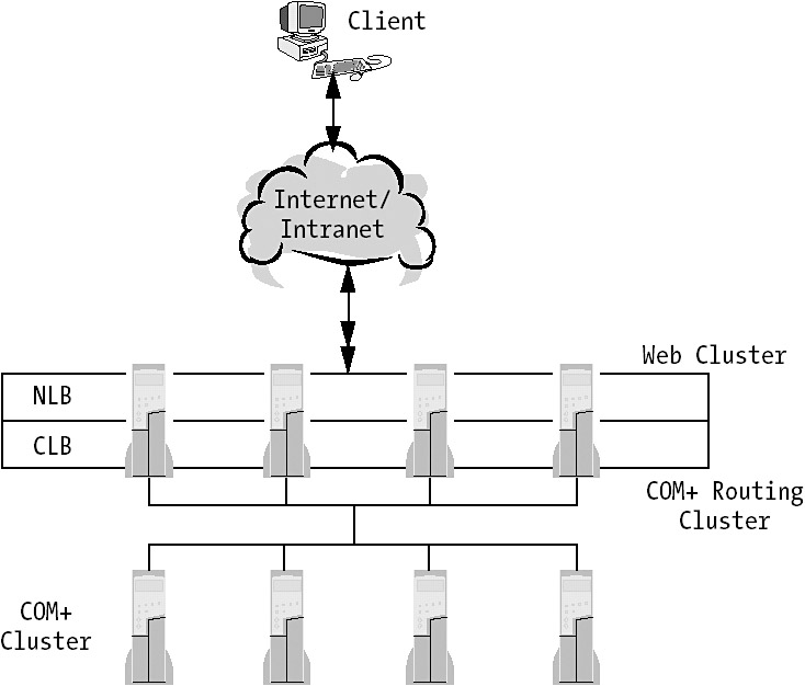 But in a more likely scenario than the one just described, the layering of the application would be different. To ease the load on the Web cluster, the COM+ components would probably be moved to their own cluster and Component Load Balancing would be used to load balance the activation requests for the COM+ components as shown in Figure 3-13.