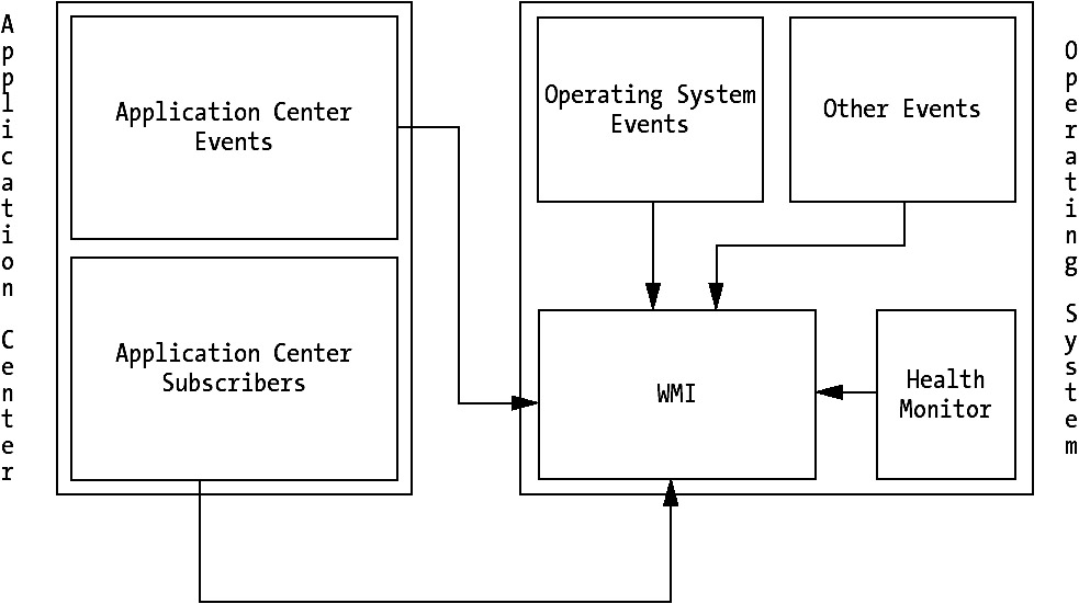 Figure 3-16 shows an overview of how Application Center, Health Monitor, and the operating system generate events and performance counters. It also shows how this data is provided to WMI.