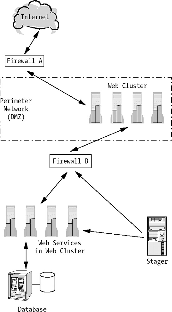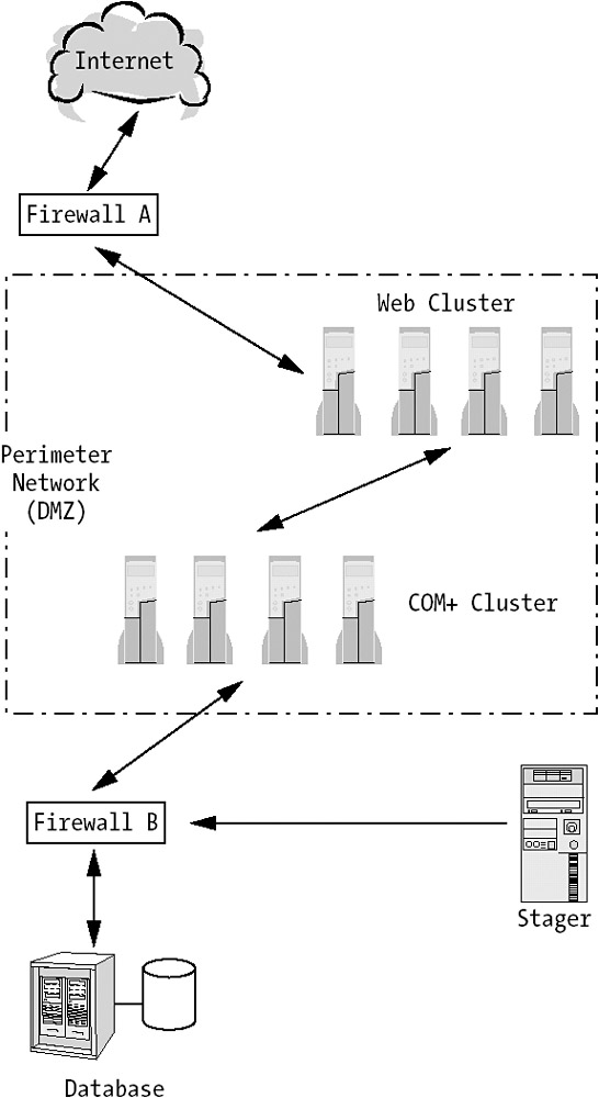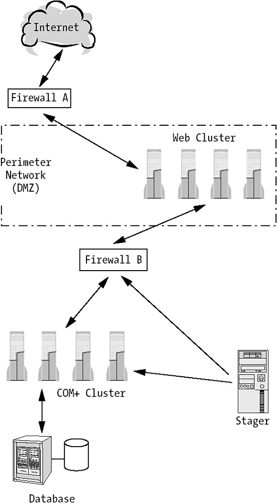 In a scenario like this, both the database and the business logic in the COM+ cluster as well as the stager are potentially exposed to users from the outside. To prevent some of these security risks, it is very common to add another firewall, thereby creating a perimeter network.