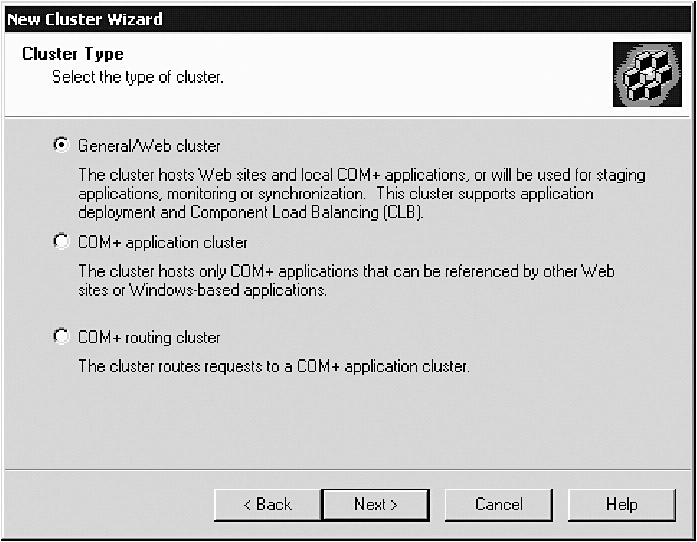 The most common cluster using Application Center would be a Web server cluster that hosts Web sites as well as local COM+ components (or assemblies in .NET). These clusters can use several load-balancing techniques. Application Center does not care if you use load-balancing techniques other than Network Load Balancing. In Figure 3-10, you can see that during setup of a new cluster you can choose the type of load balancing you will use. You still get the advantages of clustering several servers that we have already discussed.