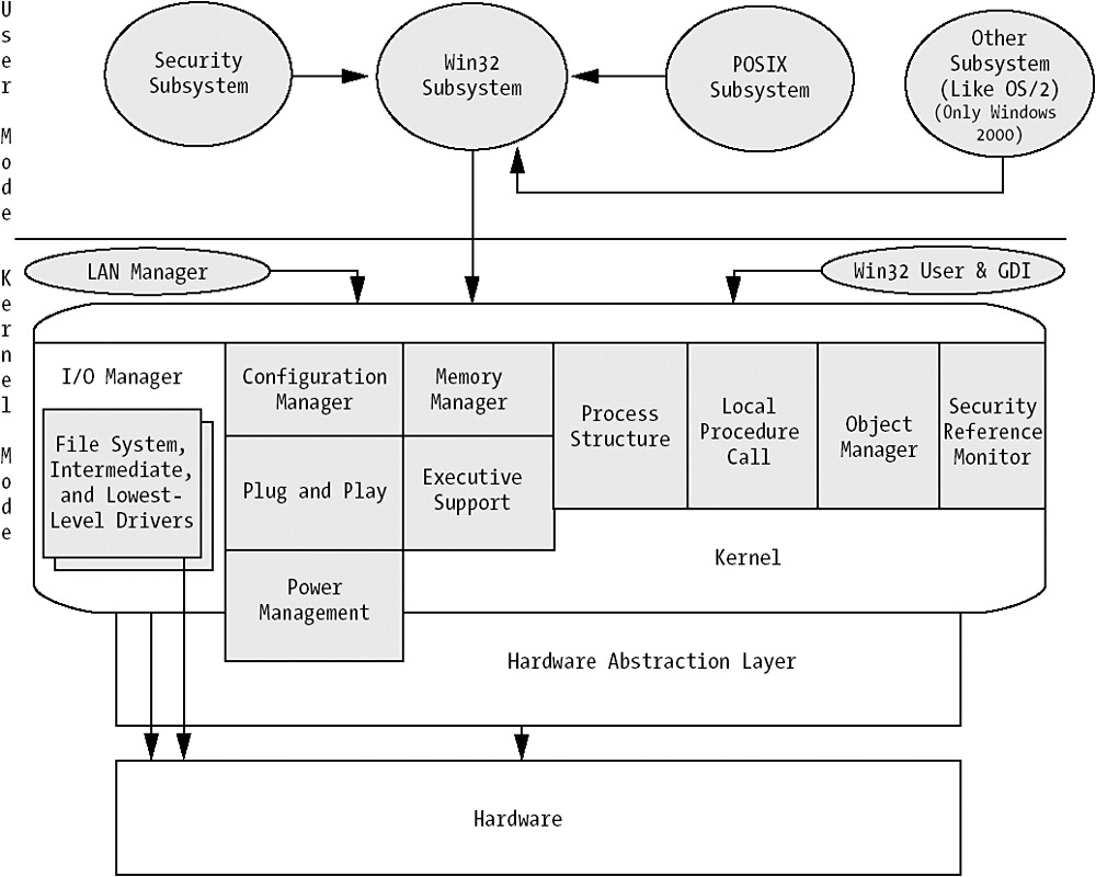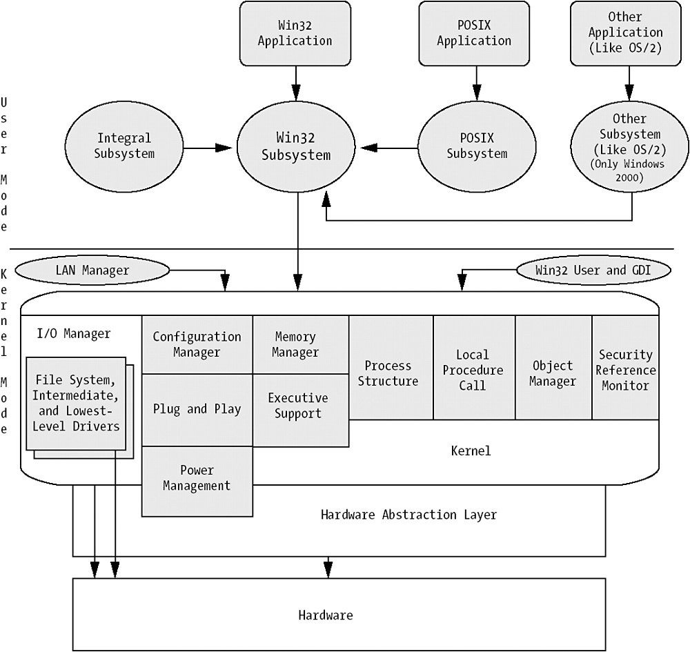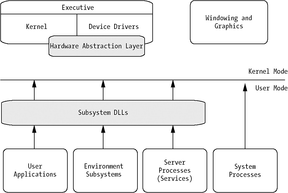 Any performance monitoring, tuning, or optimization you do on a Windows Server system involves the kernel. Actually everything you do involves the kernel. The kernel is the most central part of the operating system, and without it you do not have much use of the Windows System at all. Figure 4-1 shows an overview of the Windows architecture, which we will look at more closely later in this chapter. It is very similar to the Windows 2000 architecture.