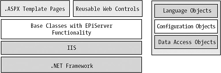 EPiServer provides several ASPX template pages that the developer can use. These templates can host reusable Web controls such as calendar controls and vote controls. The controls and the code in the code-behind page on the ASPX page use EPiServer's base classes to access the data. Besides the aforementioned reusable Web controls, this product includes several objects for handling language support, configuration, data access, and security programmatically.