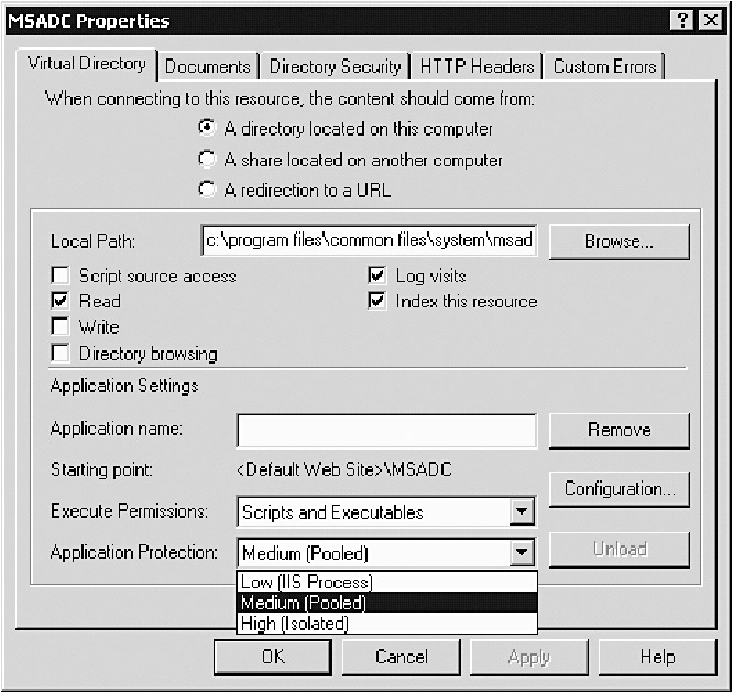 Figure 7-4 shows how to set the application protection level for a specific site. You can only set this on the Home Directory or Virtual Directory properties sheet of a Web site. You can select High (Isolated), Low (IIS Process), or Medium (Pooled) from the Application Protection drop-down list.
