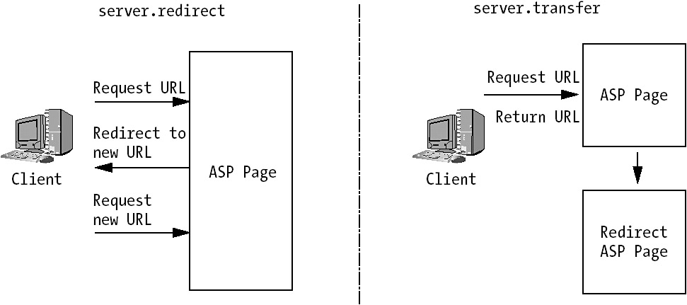 Apart from the IIS architecture itself, a lot of improvements were made to enhance the application environment. With the help of flow control capabilities in ASP, you can write more efficient Web applications by cutting down on round-trips to the server. Figure 7-7 shows the benefits of using server.transfer instead of server.redirect when a redirect to another ASP page on the same server is necessary.