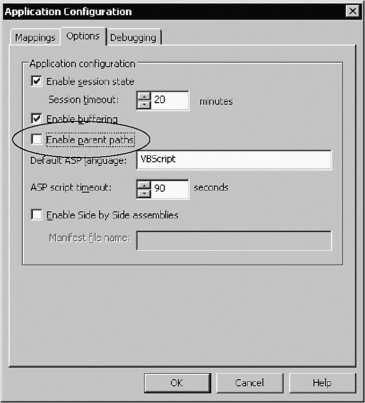 You should also change the default Web site location on your disk from c:\inetpub to some other volume, which would cause a hacker problems navigating the directory tree. In this case, the command "..\" would not give access to the C drive. To further hinder a hacker, you should disable the Enable parent paths option that allows you to use ".." in calls to functions such as MapPath. To disable it, follow these procedures: