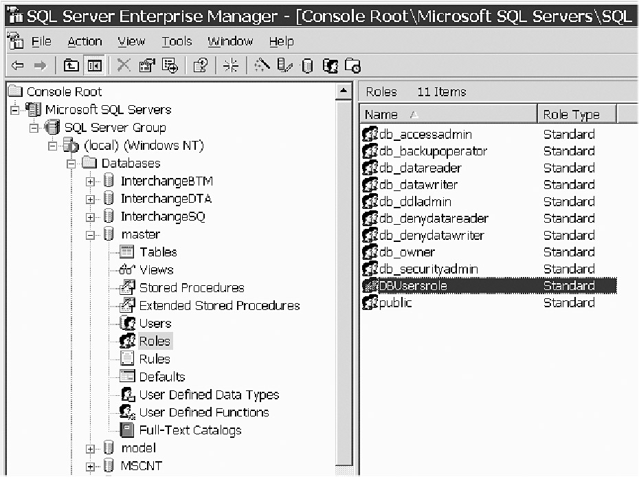 When you want to give permissions in a database on your SQL Server, you can use something called roles. There are some built-in roles you can use (see Figure 8-21), but you can also create your own. You give permissions only to roles, and then make the domain global groups members of those roles.