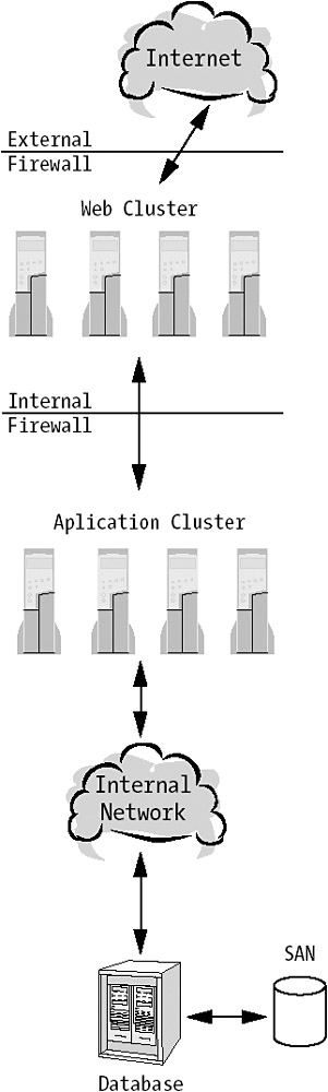 We covered how we were going to implement the physical design of our database earlier in the chapter in the section "Designing the Database." The server we use for this is Windows Server 2003 Enterprise Edition. This server has two NICs connected to two different networks. One is the network our clients (via the application layer) use to access the database. We call this the external network and configure it with the setting All Communications in Cluster Service. The other is a private network that only internal cluster communications occur on. The private network has no other computers on it beside our cluster members. This is configured with the setting Internal Cluster Communications Only. This network also has the highest priority for internal cluster communications.