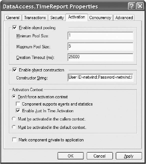 Our time reporting application will be located in the COM+ Applications folder. We browse down to the DataAccess.UserReport component, right-click it, and select Properties. We then click the Activation tab and add the connection string to the database in the Constructor String Field (see Figure 9-83).