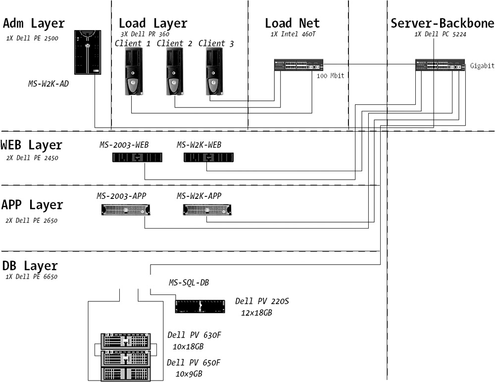 Here is a list of the equipment we were privileged to use at Dell (see Figure A-1). The results of the testing can be seen in Chapter 9, in the section "Tests at Dell."