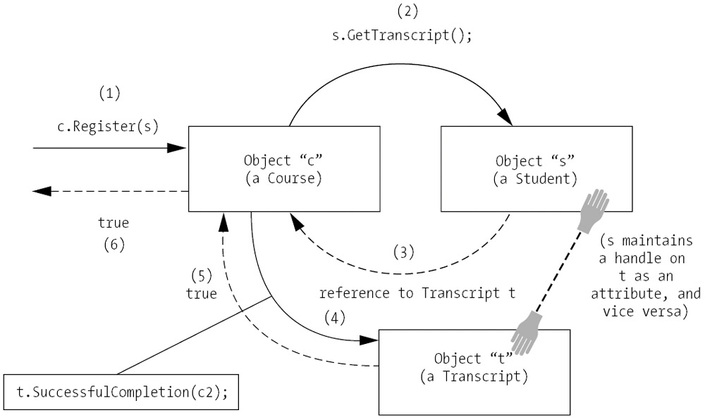 Satisfied that Student s has complied with its prerequisite requirements, Course object c finishes the job of registering the student (internal details omitted for now) and confirms the registration by responding with a value of true to the originator of the registration request that first arose in step 1. Now that c has finished with this transaction, it discards its (temporary) handle on t.