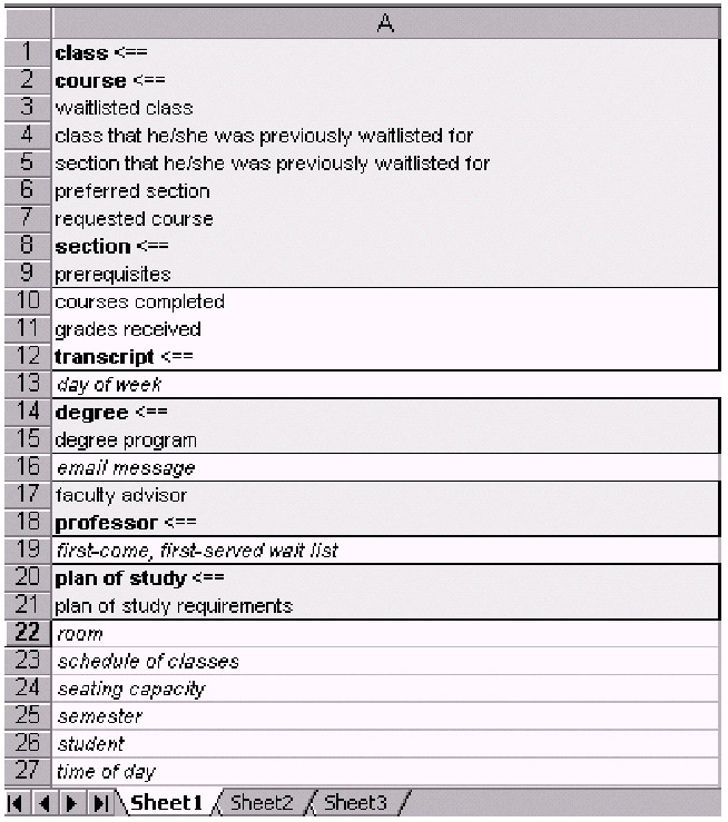 A simple spreadsheet serves as an ideal tool for recording our initial findings; just enter noun phrases as a single-column list in the order in which they occur in the specification. Don't worry about trying to eliminate duplicates or consolidating synonyms just yet; we'll do that in a moment. The resultant spreadsheet is shown in part in Figure 10-1.
