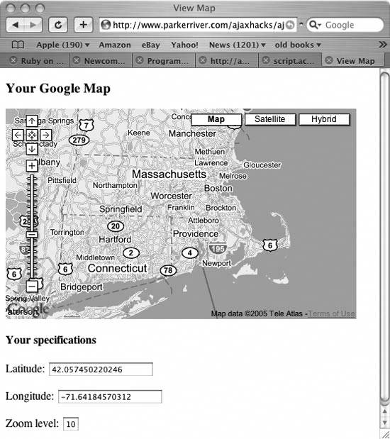 }It will probably help you visualize the application's purpose if I show you the map inside a browser window, before digging into the code. The page loads the map and displays the user's preferred coordinates and zoom level in text fields beneath it. Figure 4-1 shows the page displayed in a browser. Figure 4-1. Google Map centered on MA with zoom level 10