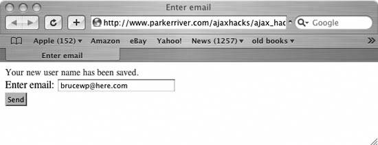 </html>The JavaScript in email.js sends the validated email address to the server, which checks an existing database of usernames and responds with a "1" if the address is already in use (details on email validation were provided in "Validate Email Syntax" [Hack #23]). The simple XML response output looks like <is_used>1</is_used>. Here is the code from the checkAddress( ) function, contained in http_request.js, that sends the validated email address: if(eml.valid)