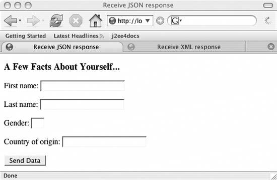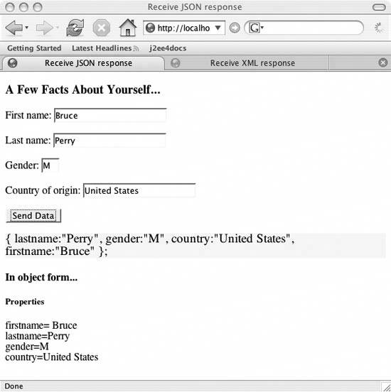 objt.country;A variable named objt stores the object literal. The values are pulled from the object with syntax such as objt.firstname. Figure 1-10 shows what the web page looks like after it has received a response. Figure 1-10. Visualizing JavaScript properties is sweet!